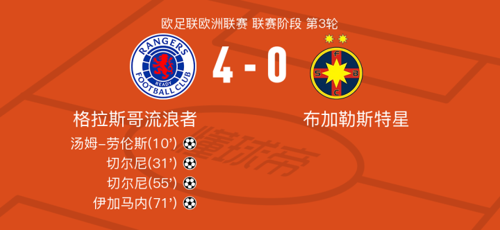 格拉斯哥流浪者4-0大胜布加勒斯特星,切尔尼两球,伊加马内建功