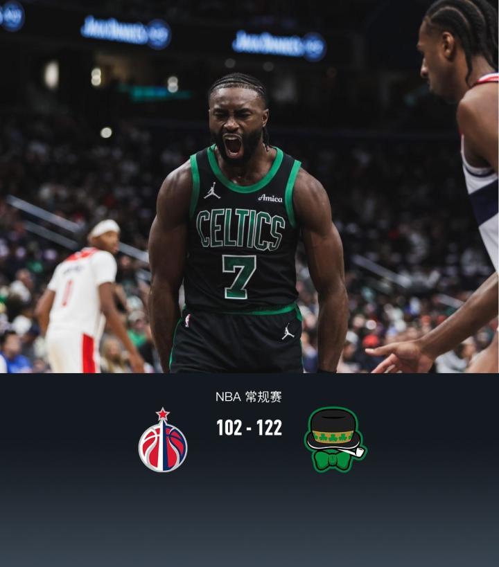 第四节奇才小鲍德温拿下7分,凯尔特人杰伦-布朗拿下10分,最终奇才102-122不敌凯尔特人