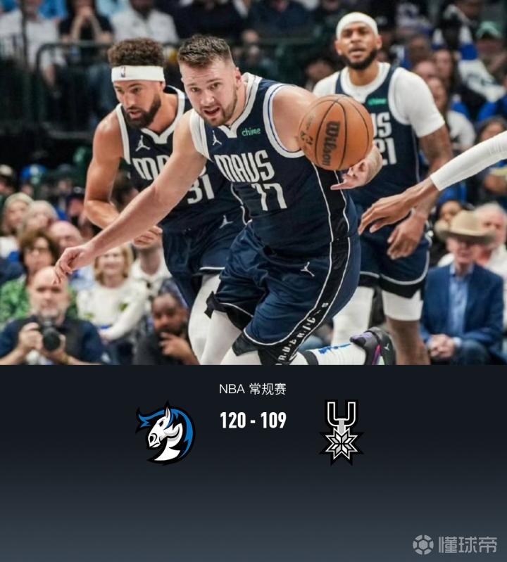 第四节,独行侠东契奇、克莱联手三分雨将分差迅速拉大至20分以上,马刺文班亚马连续得分短暂止血但未能延续势头,独行侠三分继续再度领先至20分以上,还剩半节时间马刺率先换下主力缴械投降,全场结束,独行侠120-109马刺。