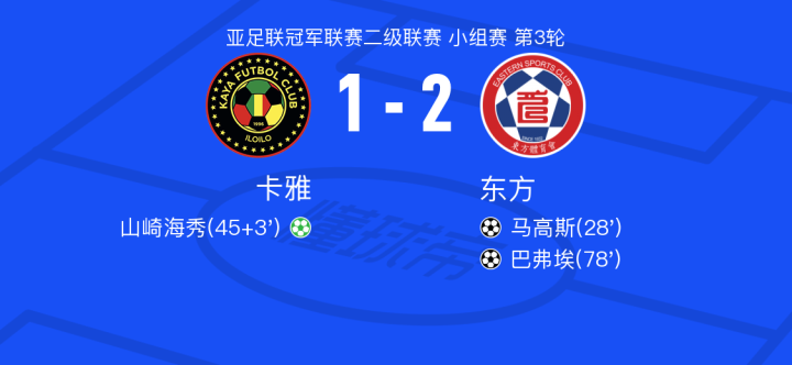 在亚足联冠军联赛小组赛的较量中,卡雅迎战东方。比赛中,东方的马高斯率先为球队取得进球。随后,卡雅的山崎海秀通过点球将比分扳平。比赛接近尾声时,东方的费利佩-萨送出助攻,巴弗埃成功破门,为东方锁定胜局。最终,东方以2比1战胜卡雅。