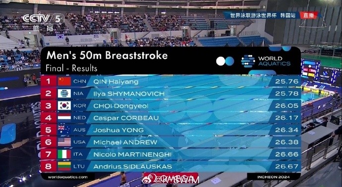 状态火热,覃海洋25秒76夺得世界杯仁川站男子50米蛙泳冠军mljjywh4115 @懂球帝2024-10-25 19:22北京时间10月25日,2024游泳世界杯(短池)仁川站迎来第二个比赛日。中国选手覃海洋出战男子50米蛙泳决赛。最终,覃海洋在冲刺阶段发挥出色,以25秒76成功夺冠。展开更多