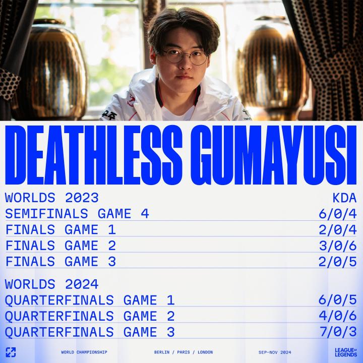 有趣的是,根据LOL官方社媒的数据,Gumayusi选手在世界赛BO5上已经达成了恐怖的连续7场0阵亡数据。