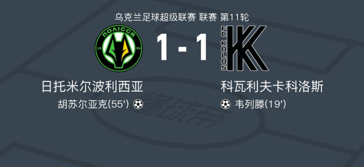 日托米尔波利西亚1-1科瓦利夫卡科洛斯,韦列滕破门,胡苏尔亚克扳平