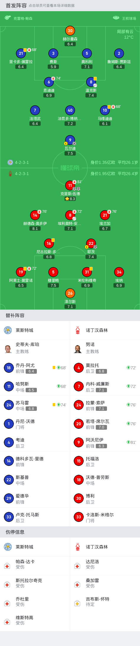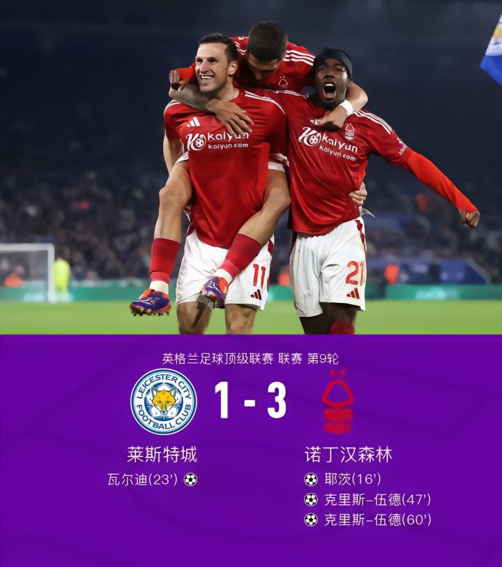 莱斯特城1-3诺丁汉森林,克里斯-伍德双响,瓦尔迪破门难救主
