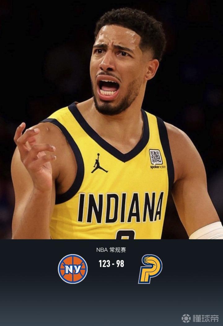 NBA战报:尼克斯123-98步行者,哈利伯顿0分,布伦森26+5+5