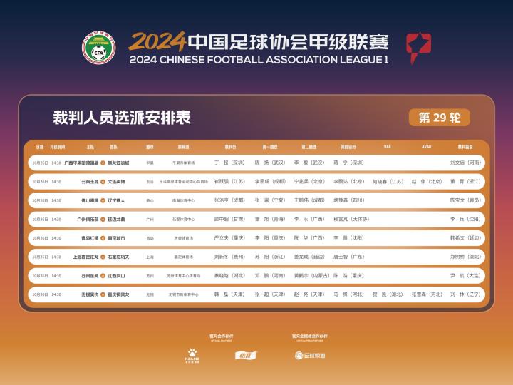 10月26日,中国足协官方公布了中甲联赛第29轮裁判员选派名单,崔跃强执法云南玉昆vs大连英博,何晓春担任VAR;顾中超执法广州队vs延边龙鼎。