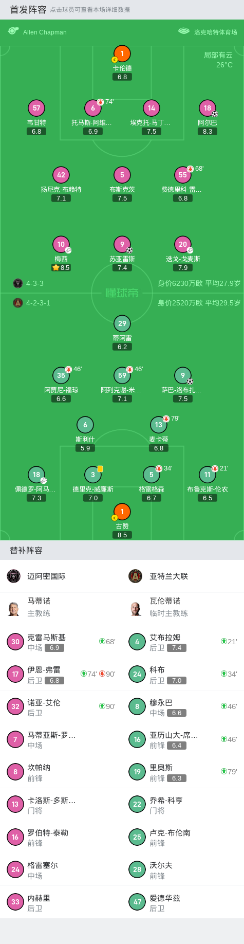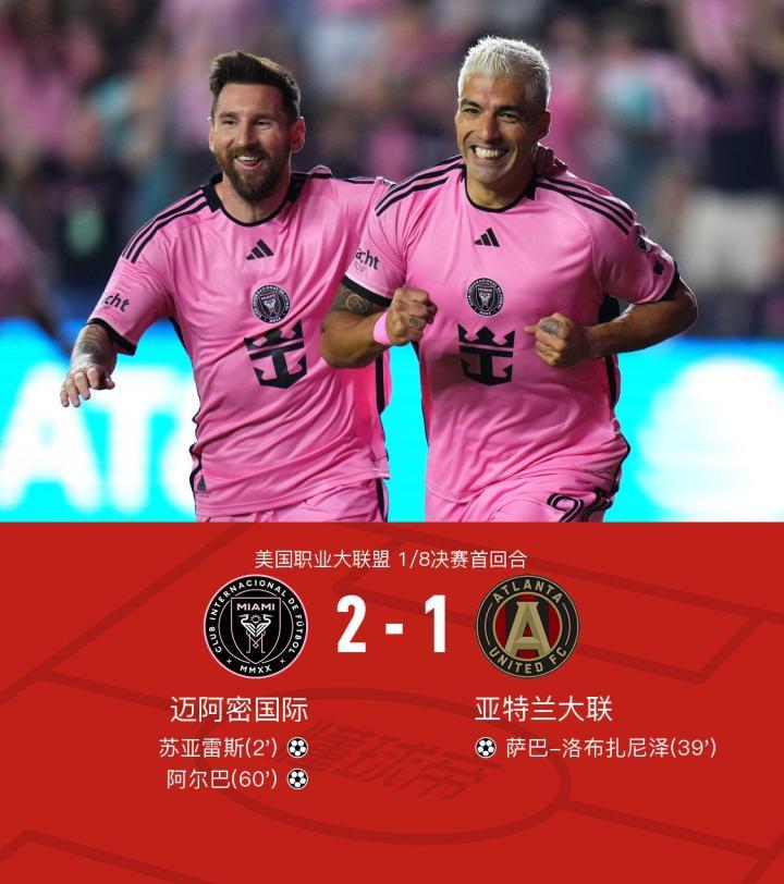 北京时间10月26日,美职联1/8决赛首回合展开较量,迈阿密国际主场迎战亚特兰大联。上半场,苏亚雷斯开场闪击破门,梅西连续远射被古赞扑出后又射中立柱,随后洛布扎尼泽小角度破门将比分扳平;下半场,梅西任意球射门稍稍偏出,随后助攻阿尔巴远射破门,古赞神勇发挥多次化解梅西的机会,苏亚雷斯近距离头球攻门顶高,伊恩-弗雷伤退。最终,迈阿密国际以2-1战胜亚特兰大联,取得了首回合的胜利。