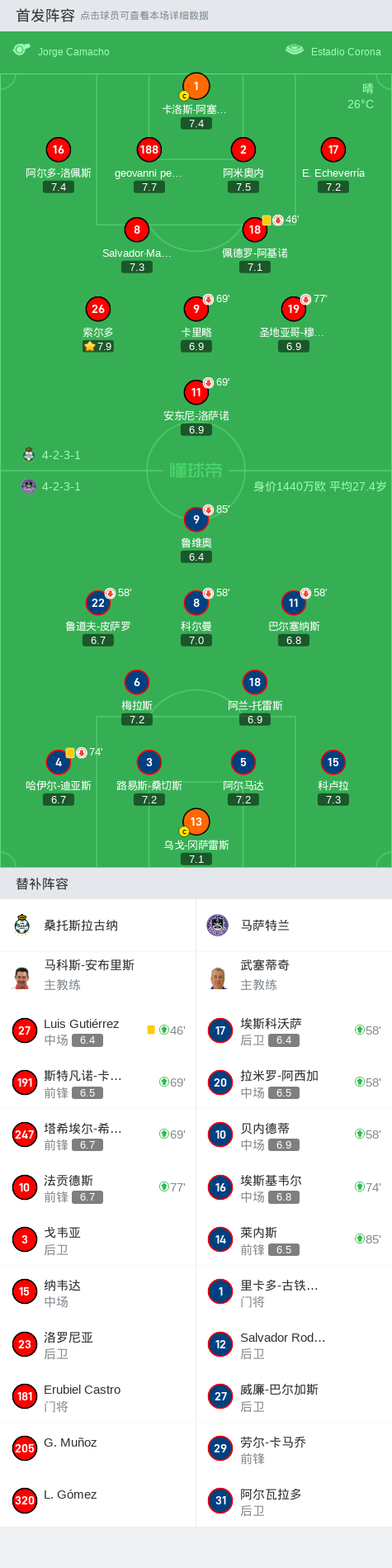 桑托斯拉古纳0-0马萨特兰,双方握手言和战报bot @懂球帝2024-10-26 11:03在墨西哥足球超级联赛春季联赛第14轮的较量中,桑托斯拉古纳坐镇主场迎战马萨特兰。经过激烈的对抗,双方均未能攻破对方球门,比赛以0-0的比分结束。两队在场上展现了顽强的防守和不懈的拼搏精神,尽管创造了一些得分机会,但都未能转化为进球。桑托斯拉古纳和马萨特兰各自收获一分,继续在联赛中稳步前行。点击查看本场比赛详细数据>>点击查看墨超完整积分榜>> 球队阵容 技术统计 展开更多