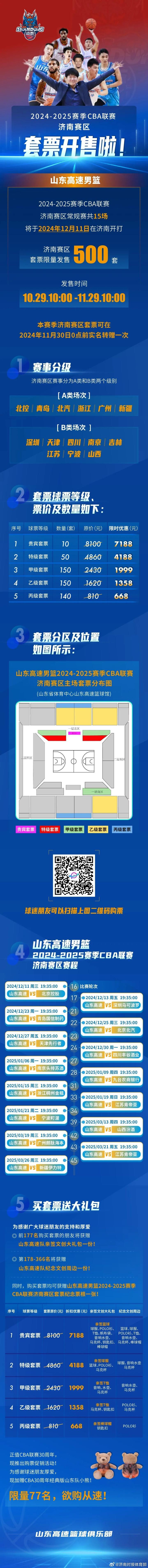 10月25日,CBA山东男篮官方消息,山东男篮济南赛区常规赛套票将于10月29日开售,最低票价每套668元。