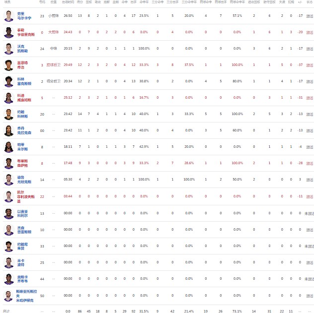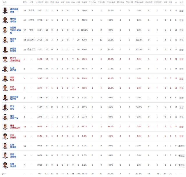 犹他爵士柯林斯14分7板4助1断1帽,马尔卡宁13分8板2助1断,基扬特-乔治12分2板3助2断;