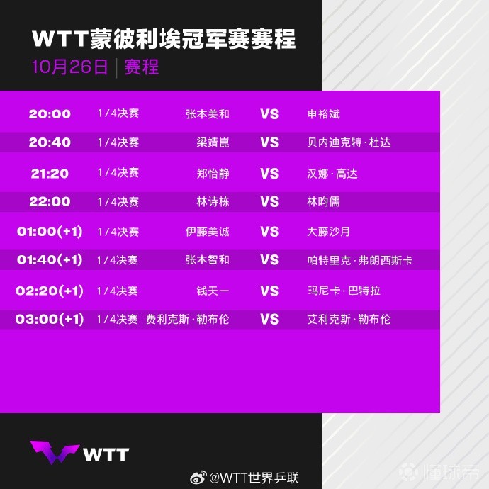 北京时间10月26日,WTT蒙彼利埃冠军赛男单1/8决赛战罢,林诗栋、梁靖崑晋级八强,大勒布伦力克莫雷加德。