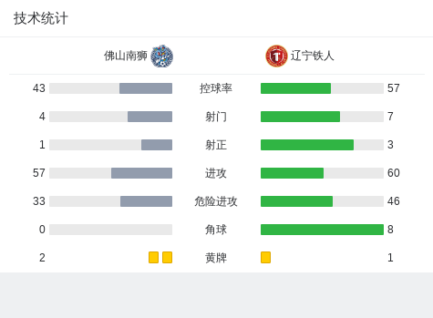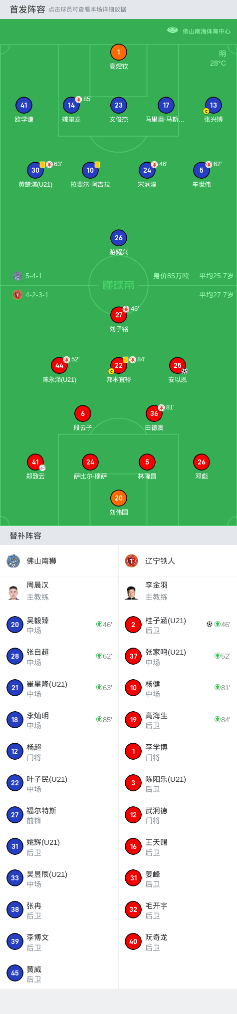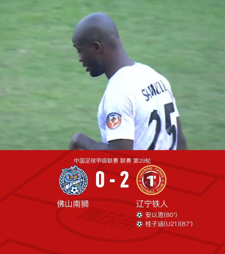 在中国足球甲级联赛第29轮的比赛中,佛山南狮坐镇主场迎战辽宁铁人。比赛第80分钟,安以恩补射率先打破僵局,7分钟后桂子涵扣球过人后再下一城。最终,辽宁铁人以2比0战胜佛山南狮,取得了本场比赛的胜利。
