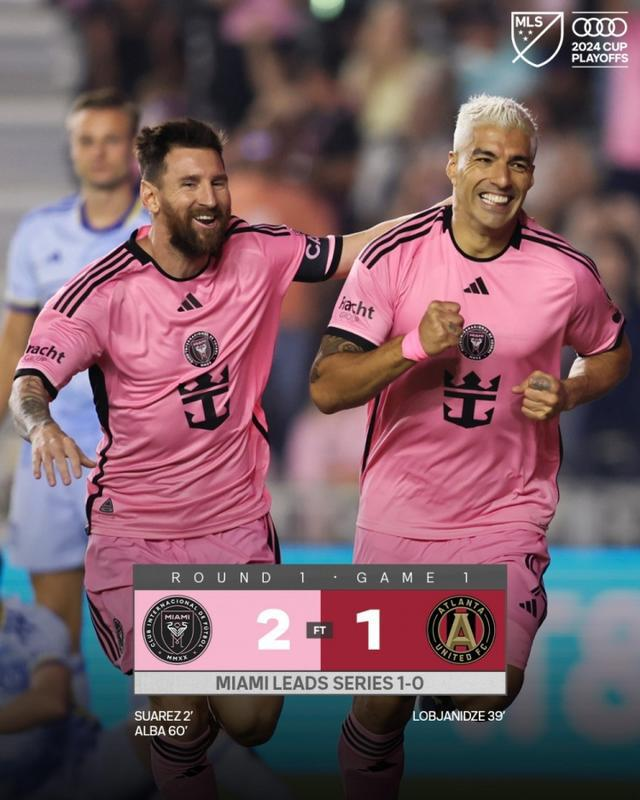在北京时间今天上午结束的美职联季后赛首轮比赛中,迈阿密国际凭借着苏亚雷斯的进球,梅西助攻阿尔巴的进球,主场2-1击败亚特兰大联。