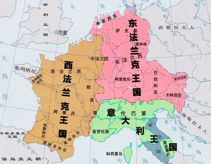 中法兰克王国是意大利的前身,说意大利语。西法兰克王国是法兰西的前身,说法语。意大利语和法语都属于罗曼语族。