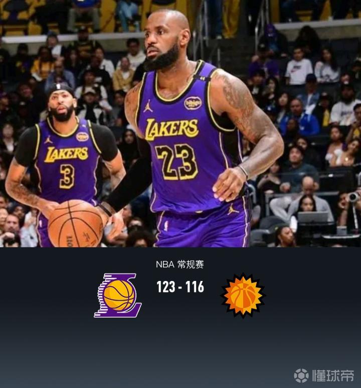 NBA常规赛焦点战洛杉矶湖人主场迎战菲尼克斯太阳。上半场太阳三巨头发挥出色攻守两端压制湖人,一度领先22分,次节后半段湖人开始反扑,半场结束太阳61-52领先湖人,下半场湖人继续反扑詹姆斯、浓眉、里夫斯三人合力完成反超,末节湖人迅速将分差拉大至两位数,太阳反扑无果,最终湖人123-116逆转太阳迎开季连胜。