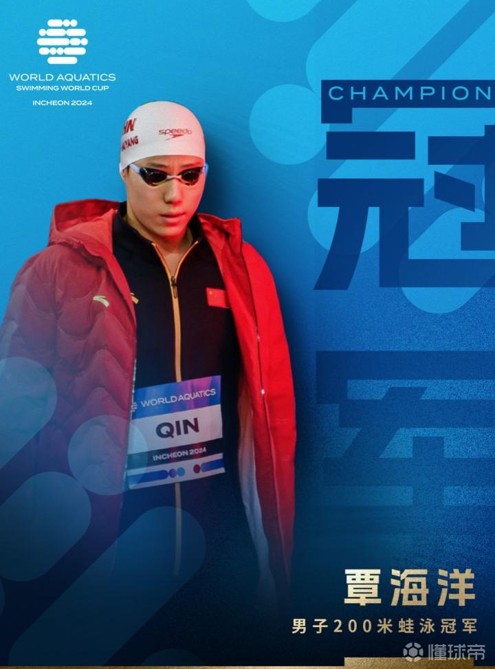 游泳世界杯仁川站(短池)男子200米蛙泳决赛,中国选手覃海洋覃海洋前程发力,中程稍微落后,后程再次发力,最终游出2:02.57 夺得冠军,澳大利亚选手约书亚-杨、荷兰选手科尔博分别获得第二、三名。