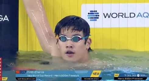北京时间10月26日,游泳世界杯仁川站(短池)男子800米自由泳比赛中,中国选手潘展乐以7:35.30夺得冠军,打破赛会纪录。