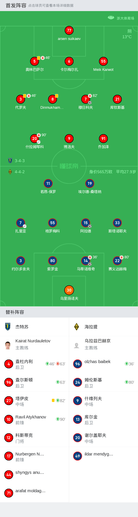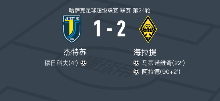 在哈萨克足球超级联赛第24轮的较量中,杰特苏坐镇主场迎战海拉提。比赛伊始,杰特苏的穆日科夫在什拉姆琴科的精妙传球下,成功攻入一球,为主队取得领先。然而,海拉提迅速做出回应,马蒂诺维奇接到扎里亚的助攻,扳平比分。比赛接近尾声时,海拉提的阿拉德再度建功,帮助球队反超比分。最终,海拉提以2比1的比分逆转战胜杰特苏。