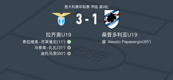 拉齐奥U19 3-1桑普多利亚U19取意青联3连胜,迪托马索、马泰奥-扎扎破门