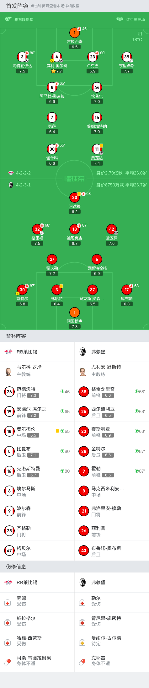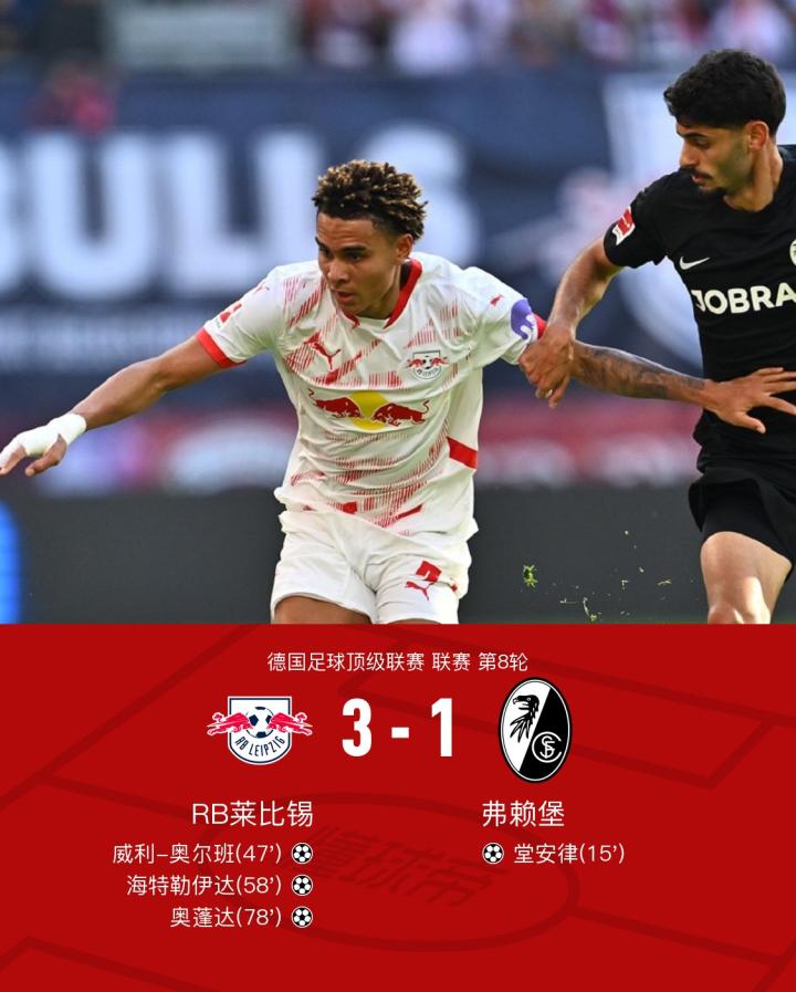 莱比锡3-1弗赖堡暂登顶,奥蓬达、奥尔班破门,堂安律头槌