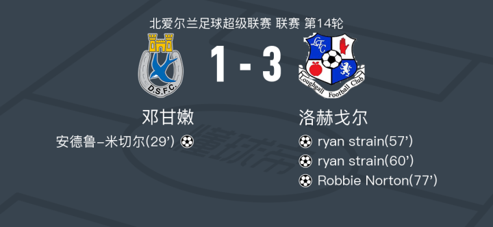 在北爱尔兰足球超级联赛第14轮的较量中,邓甘嫩坐镇主场迎战洛赫戈尔。比赛中,邓甘嫩的安德鲁-米切尔率先为球队取得进球。然而,洛赫戈尔的ryan strain表现出色,接连攻入两球,帮助球队反超比分。随后,Robbie Norton再下一城,进一步扩大了洛赫戈尔的领先优势。最终,比赛以邓甘嫩1-3不敌洛赫戈尔告终。