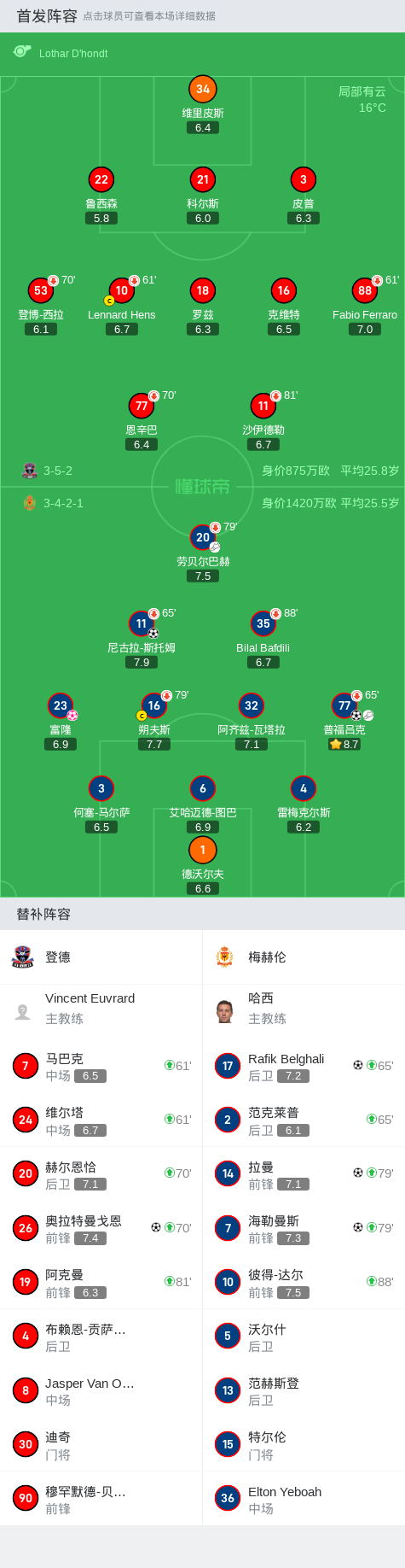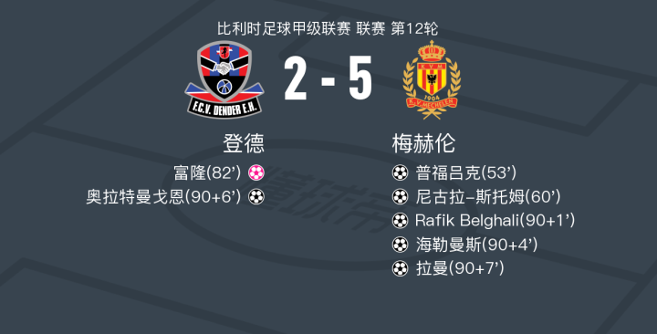 在比利时足球甲级联赛第12轮的较量中,登德坐镇主场迎战梅赫伦。比赛中,梅赫伦展现了强大的进攻火力。普福吕克率先为梅赫伦打开局面,随后他又助攻尼古拉-斯托姆再下一城。尽管富隆不慎自摆乌龙,但梅赫伦并未受到影响,Rafik Belghali和海勒曼斯接连破门,拉曼也在比赛尾声时锦上添花。登德方面,奥拉特曼戈恩在比赛中为球队打入一球。最终,梅赫伦以5比2的比分战胜登德,取得了这场比赛的胜利。