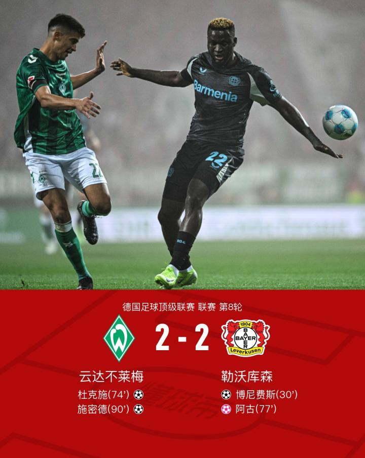 北京时间10月27日0:30,在德国足球顶级联赛第8轮的较量中,云达不莱梅坐镇主场迎战勒沃库森。上半场,博尼费斯在杰里米-弗林蓬的助攻下率先破门;下半场,杜克施头球扳平,随后阿古不慎自摆乌龙,施密德终场前再度将比分扳平。最终,双方以2-2握手言和。