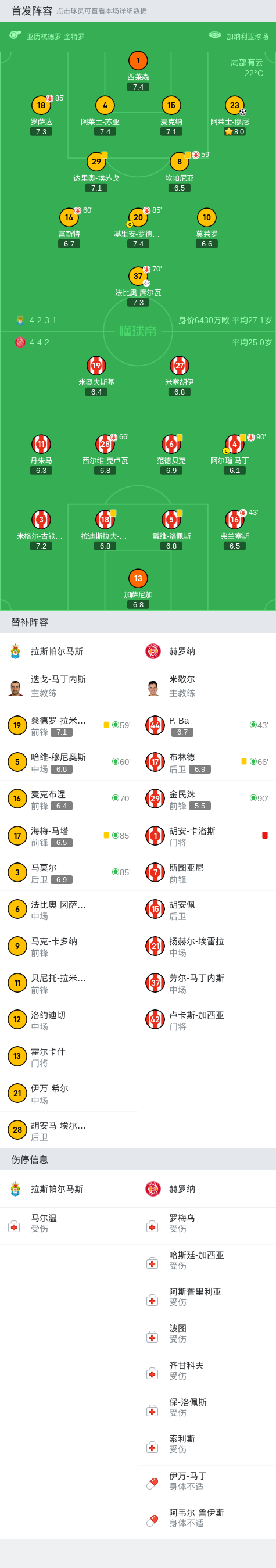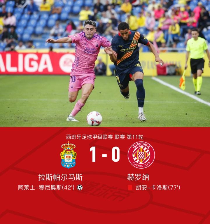 在西班牙足球甲级联赛第11轮的较量中,拉斯帕尔马斯坐镇主场迎战赫罗纳。上半场,范德贝克外脚背破门被判皮球出界在先进球无效,马丁内斯和古铁雷斯先后两次攻门均被西莱森挡出,席尔瓦助攻穆尼奥斯后点劲射入网;下半场,莫莱罗内切兜射远角偏出,古铁雷斯远射变线稍稍高出,卡洛斯在替补席上疑似不满判罚被红牌罚出场,罗德里格斯迎球推射中柱。最终,拉斯帕尔马斯以1-0的比分战胜赫罗纳,取得了本场比赛的胜利。