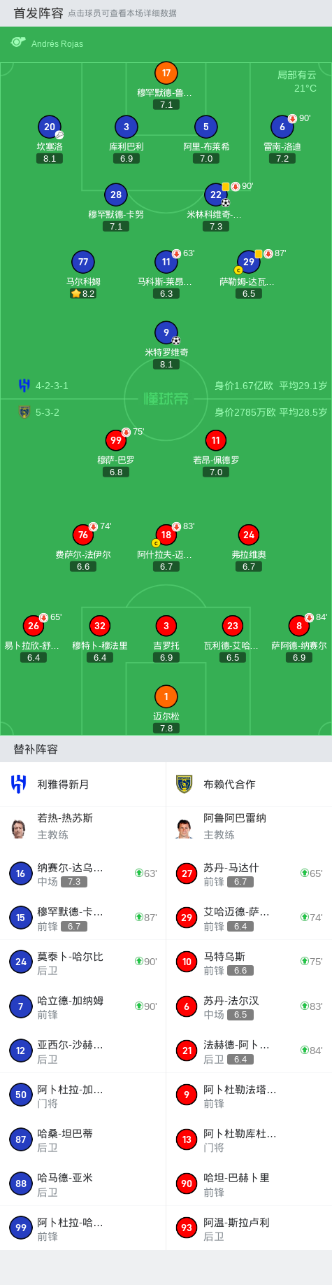 利雅得新月2-0布赖代合作,米特罗维奇、米林科维奇破门