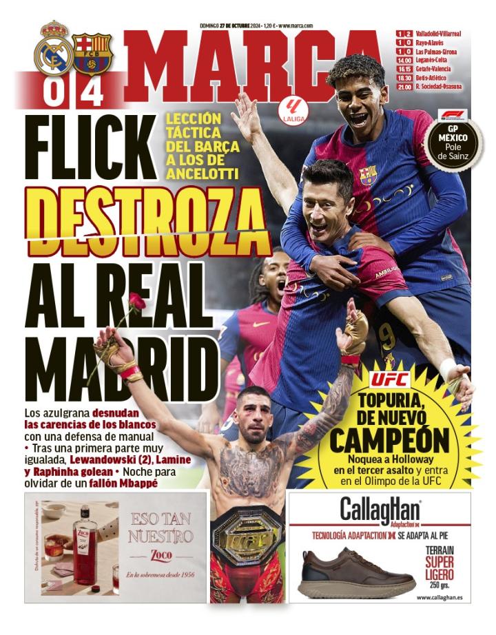 对此,《马卡报》发布了今日头版,标题为“弗里克摧毁皇家马德里,巴萨给安切洛蒂上了一堂战术课。”