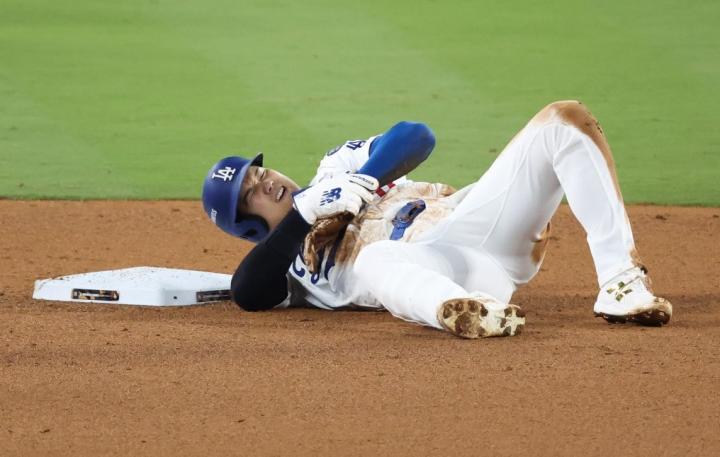 第7局比赛中,道奇队巨星大谷翔平受伤离场。他在盗二垒时,左手腕压在地面,在被触杀出局之后,大谷躺在地上表情非常痛苦。多家媒体报导他的左肩受伤。