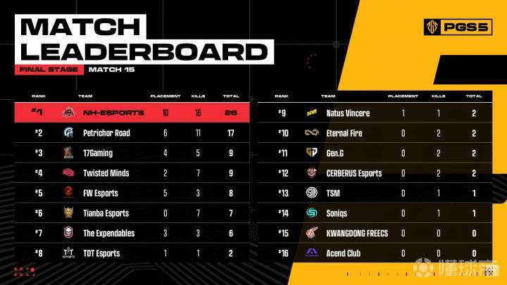 MATCH15,NH一路推进16杀得到26分,满编进入七阶段轻松吃鸡。PCL在DAY3终于找到状态,包揽本局游戏前三。