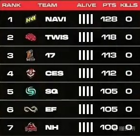 同积128分的NAVI也在同时期被淘汰。六阶段TWIS混战中拿到多个击杀,一举跃至第一,拿下最终冠军。GEN也凭借最后一局游戏吃鸡摆脱了倒一的名次。