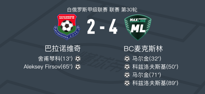 在白俄罗斯甲级联赛第30轮的较量中,巴拉诺维奇坐镇主场迎战BC麦克斯林。比赛中,巴拉诺维奇的舍甫琴科率先破门,为球队取得领先。随后,BC麦克斯林的马尔金在队友的助攻下扳平比分。紧接着,科兹洛夫斯基也为BC麦克斯林攻入一球,帮助球队反超。 巴拉诺维奇的Aleksey Firsov随后再度为主队建功,将比分扳平。然而,BC麦克斯林的马尔金再次展现出色的得分能力,再次将比分改写。比赛接近尾声时,科兹洛夫斯基再度破门,锁定胜局。最终,BC麦克斯林以4-2的比分战胜巴拉诺维奇,取得了本场比赛的胜利。
