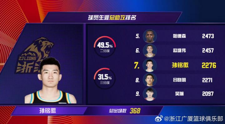 孙铭徽CBA生涯助攻总数超越吕晓明,来到历史助攻榜第七位凡尔赛小木屋 @懂球帝2024-10-27 22:3210月27日,CBA常规赛继续进行,广厦男篮107-86战胜天津男篮。本场比赛,广厦球员孙铭徽出战31分钟,投篮11中6,三分2中1,罚球2中2,得到15分3篮板1盖帽,并送出14次助攻。此役过后,孙铭徽CBA生涯助攻总数达到2276个,超越吕晓明来到CBA历史助攻榜第七位,排在他身前的是生涯至今送出2457记助攻的辽宁后卫赵继伟。展开更多