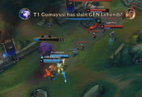 第17钟,T1中上两人河道抓到Lehends,随后众人集结上路再收掉GEN上辅,9-1。