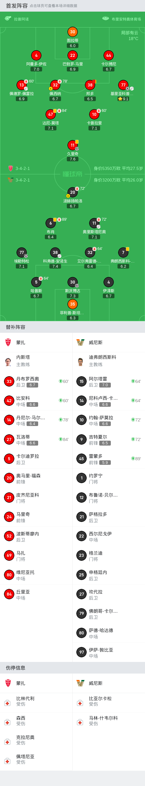 第39分钟,威尼斯球员科弗德-安诺生助攻斯沃博达打入一球。