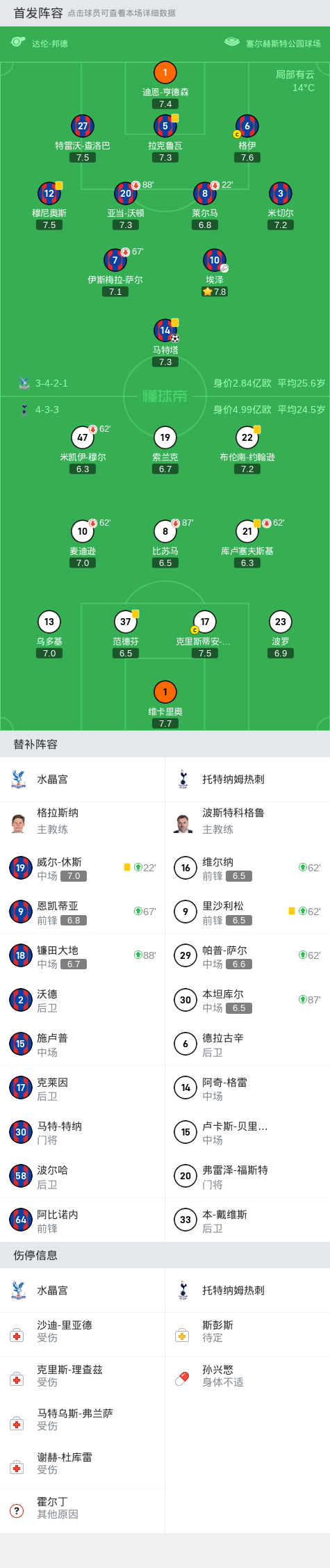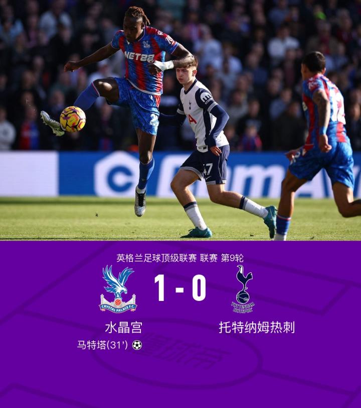 第31分钟,热刺后场传导出现失误,水晶宫抢断后由马特塔完成破门