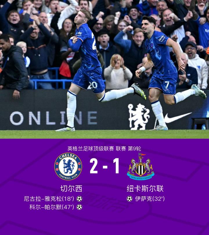 在英格兰足球顶级联赛第9轮的较量中,切尔西坐镇主场迎战纽卡斯尔联。比赛中,切尔西的尼古拉-雅克松在佩德罗-内托的助攻下率先为球队取得领先。随后,纽卡斯尔联的伊萨克在刘易斯-霍尔的助攻下扳平比分。下半场,切尔西的科尔-帕尔默在拉维亚的助攻下再次为主队取得领先。最终,切尔西以2-1战胜纽卡斯尔联,取得了本场比赛的胜利。