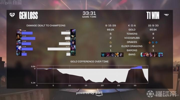第33分钟,中路团战,Faker阵亡,GEN打出1换4直推高地团灭GEN结束比赛,9-15。