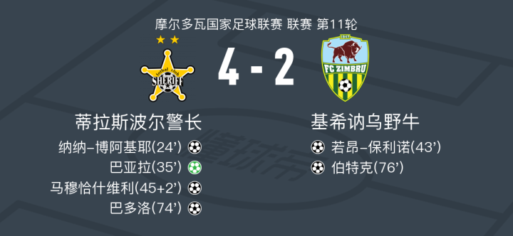 蒂拉斯波尔警长4-2基希讷乌野牛,巴亚拉点射、巴多洛破门