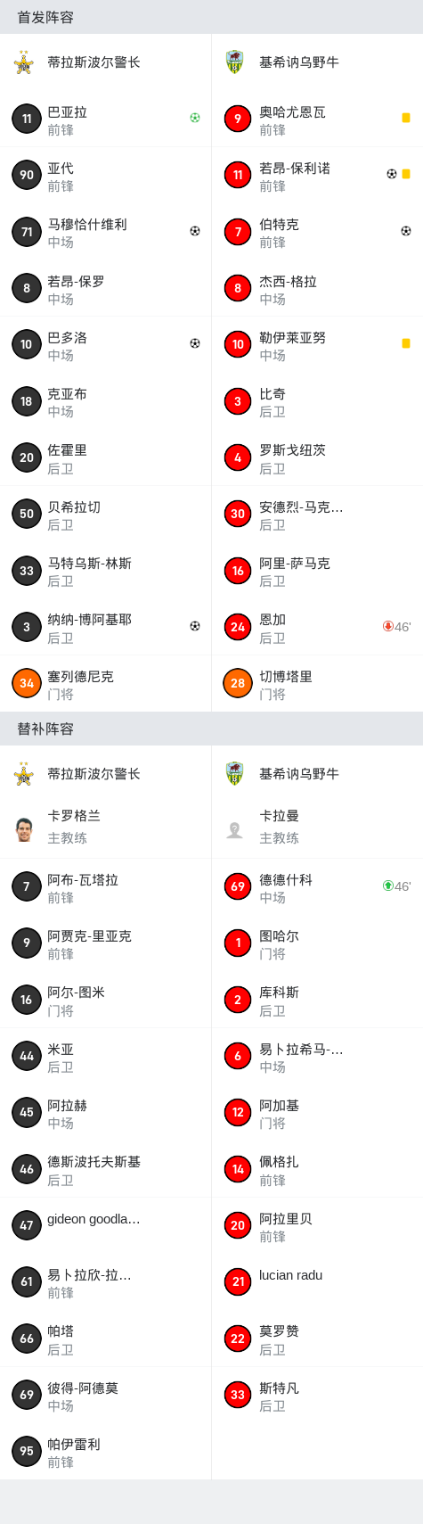 在摩尔多瓦国家足球联赛第11轮的较量中,蒂拉斯波尔警长坐镇主场迎战基希讷乌野牛。比赛中,蒂拉斯波尔警长的纳纳-博阿基耶率先为球队打开局面,随后巴亚拉通过点球扩大领先优势。基希讷乌野牛的若昂-保利诺为球队扳回一城,但马穆恰什维利再次为主队拉开差距。下半场,巴多洛再下一城,进一步巩固了蒂拉斯波尔警长的领先地位。尽管伯特克为基希讷乌野牛再度缩小比分差距,但最终蒂拉斯波尔警长以4-2的比分取得胜利。
