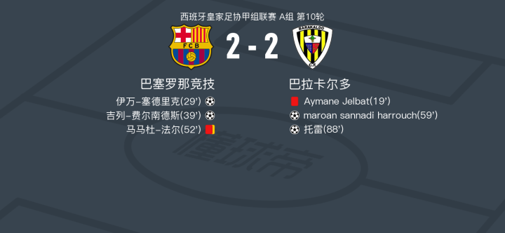 在西班牙皇家足协甲组联赛A组第10轮的比赛中,巴塞罗那竞技坐镇主场迎战巴拉卡尔多。比赛中,巴塞罗那竞技的伊万-塞德里克和吉列-费尔南德斯各自为球队贡献了一粒进球。巴拉卡尔多方面,maroan sannadi harrouch和托雷也分别为球队建功。最终,双方以2-2握手言和,比赛精彩纷呈,双方球员都展现了出色的竞技状态。