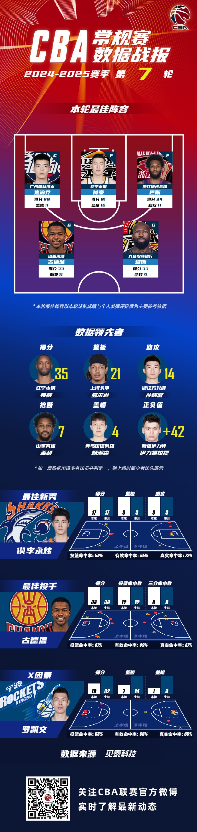 24-25赛季CBA常规赛第七轮全部战罢,CBA联赛官方也公布了本轮最佳阵容的5名球员。