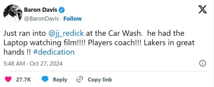 此前,前NBA球星拜伦-戴维斯在社媒上爆料称,湖人队主帅雷迪克在洗车时还在看比赛视频。雷迪克在接受采访时谈到此事,他对此进行了证实。