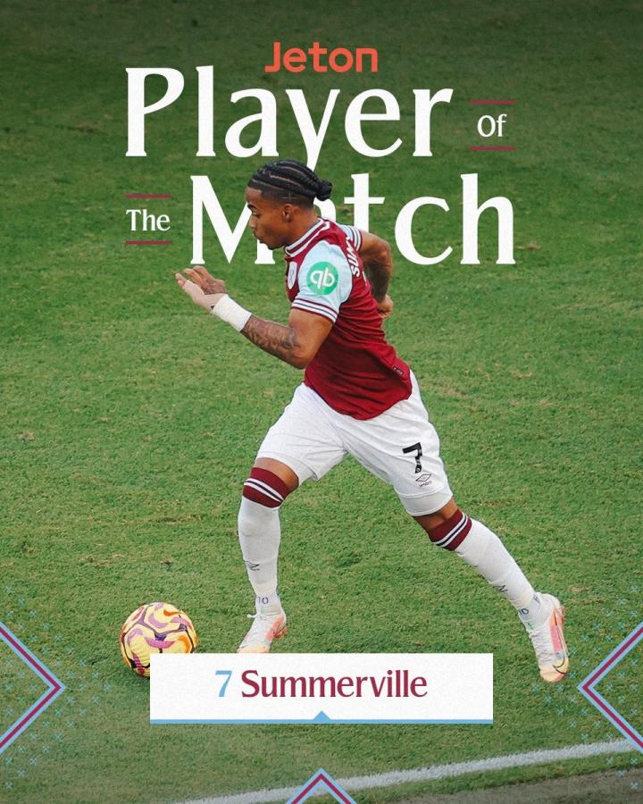 替补建功,西汉姆联官方:萨默维尔当选vs曼联队内最佳球员ZeroTsu_02 @懂球帝2024-10-28 17:43西汉姆联官方消息,萨默维尔当选vs曼联队内最佳球员,在对阵曼联的比赛中,萨默维尔替补出场打进一球。在英超第9轮主场对阵曼联的比赛中,萨默维尔在下半场替补出场,在比赛第74分钟接丹尼-英斯助攻率先得分,最终西汉姆联凭借着补时阶段的点球绝杀曼联。本赛季,22岁的萨默维尔代表西汉姆联在各项赛事中出场10次,其中3次为首发出场,打进1球。展开更多