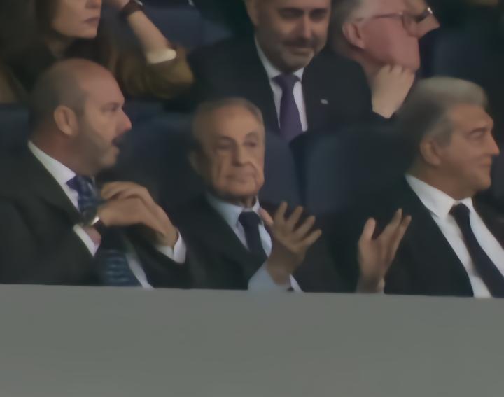 根据西班牙媒体提供的画面,在本场国家德比中,当皇家马德里在场上比分0-2落后的时候,皇马主席弗洛伦蒂诺无奈地摊了摊手,而在他身旁的拉波尔塔掩盖不住笑容。