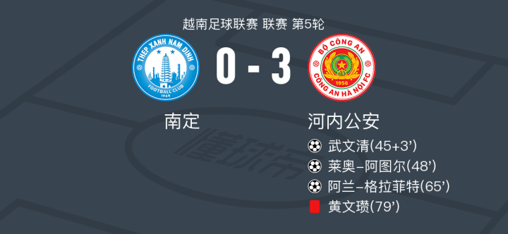 在越南足球联赛第5轮的较量中,南定队坐镇主场迎战河内公安队。比赛中,河内公安队的武文清率先为球队打开局面,随后莱奥-阿图尔再下一城,阿兰-格拉菲特也贡献了一粒精彩进球。尽管河内公安队在比赛中遭遇黄文瓒被罚下的困境,但他们依然以3比0的比分完胜南定队,取得了一场令人瞩目的胜利。