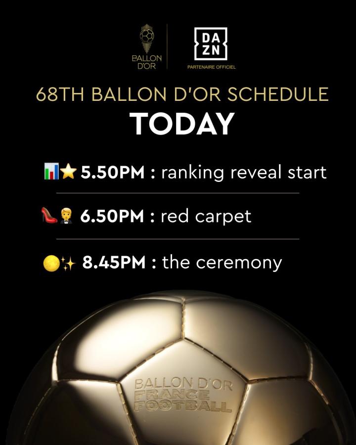 典礼当晚将颁发男足金球奖、女足金球奖、科帕奖、雅辛奖、苏格拉底奖、盖德-穆勒奖以及年度最佳教练与俱乐部奖项。