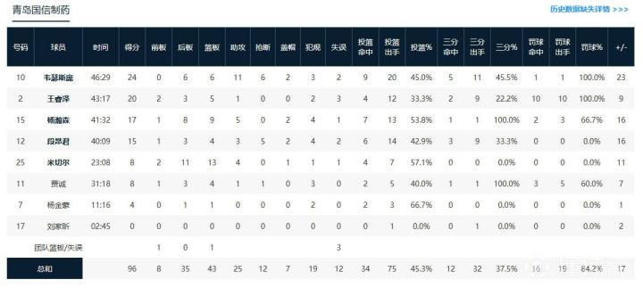 北京时间10月28日中国男子篮球职业联赛 常规赛,青岛国信制药对阵辽宁本钢。半场青岛52-48辽宁,最终青岛97-79辽宁。青岛国信制药奎因达里-韦瑟斯庞24分6板10助,王睿泽20分5板2助;辽宁本钢凯尔-弗格17分2板6助,付豪13分9板。本场比赛,辽宁外援沙约克出战19分钟,投篮11中0,仅得到1篮板1助攻,此外还有1失误1犯规。